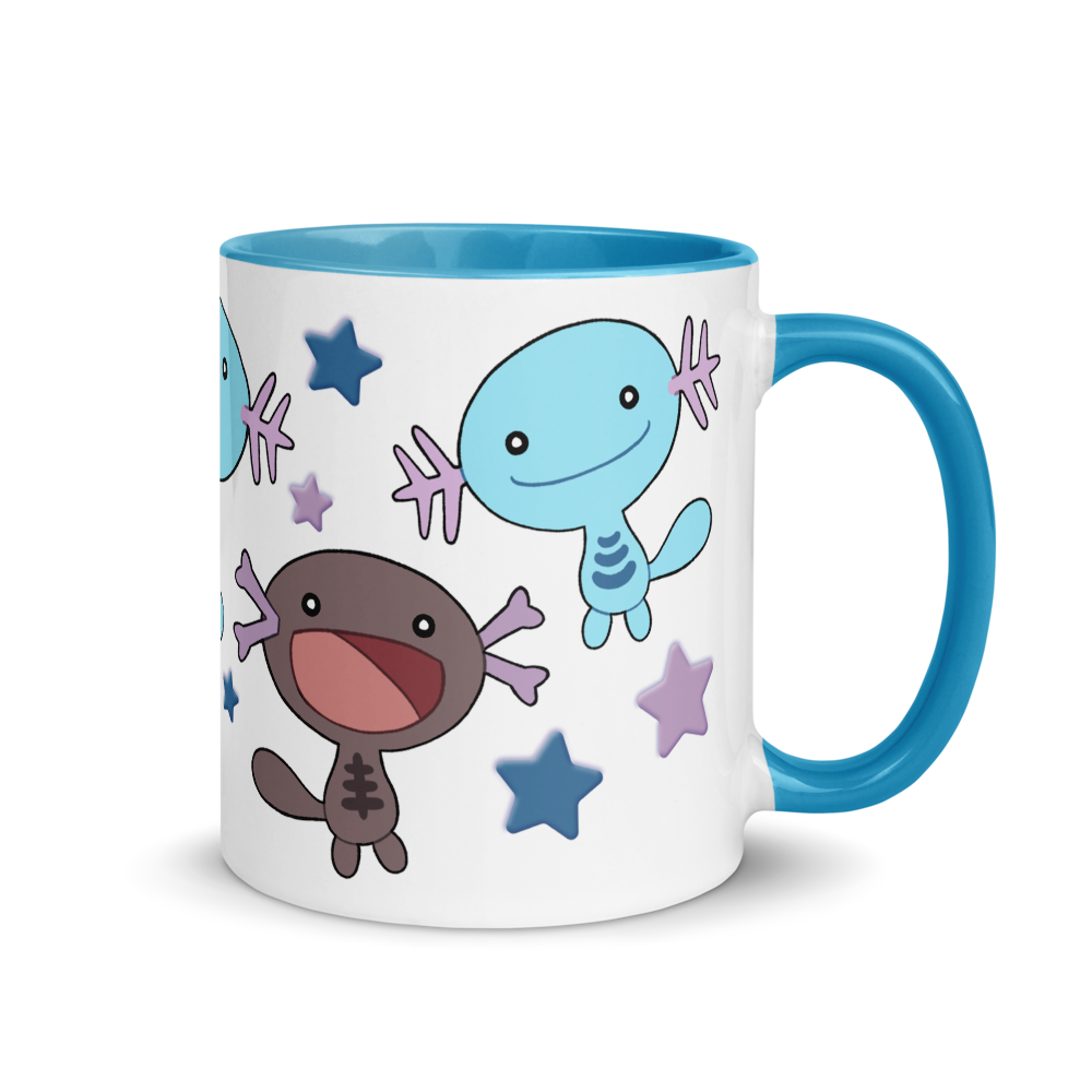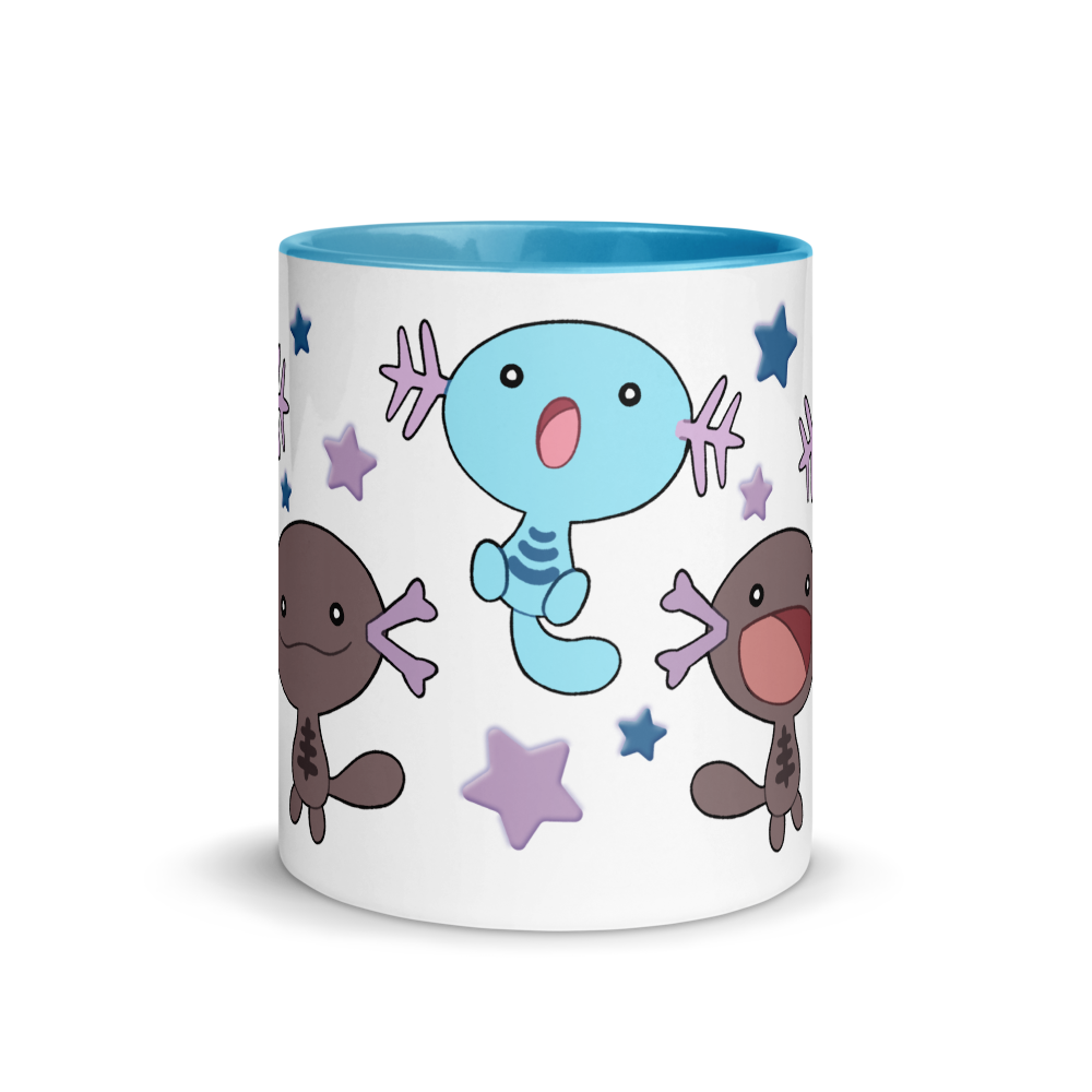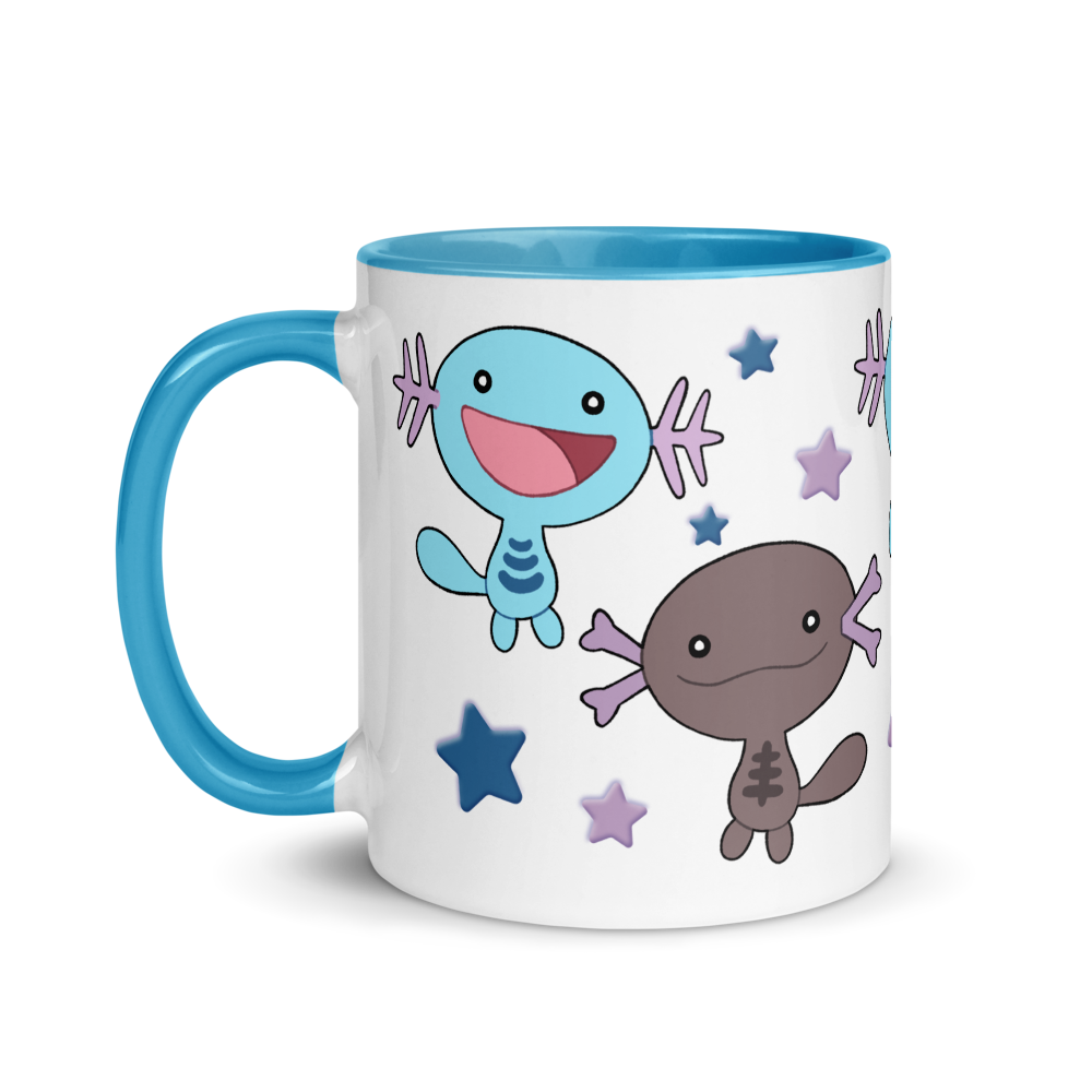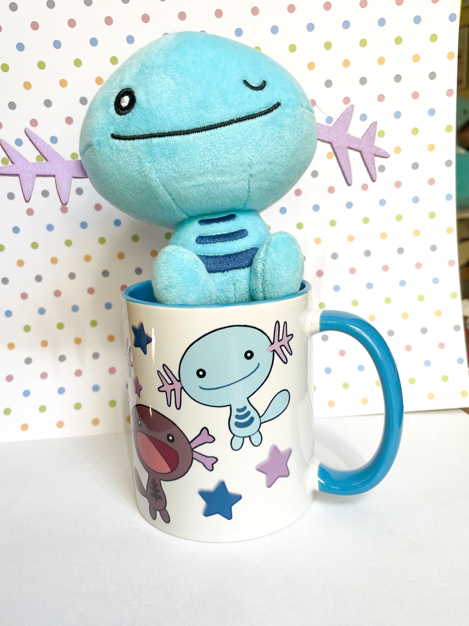 These ceramic mugs feature some cute Wooper and Paldean Wooper as well as a vibrant blue rim, handle, and inside.