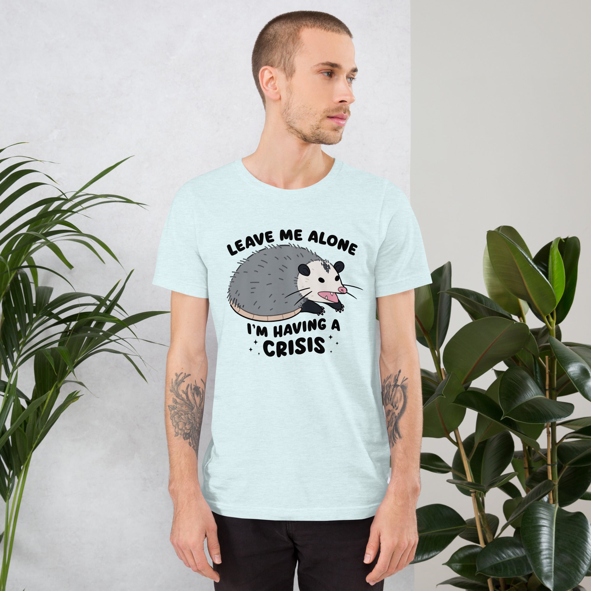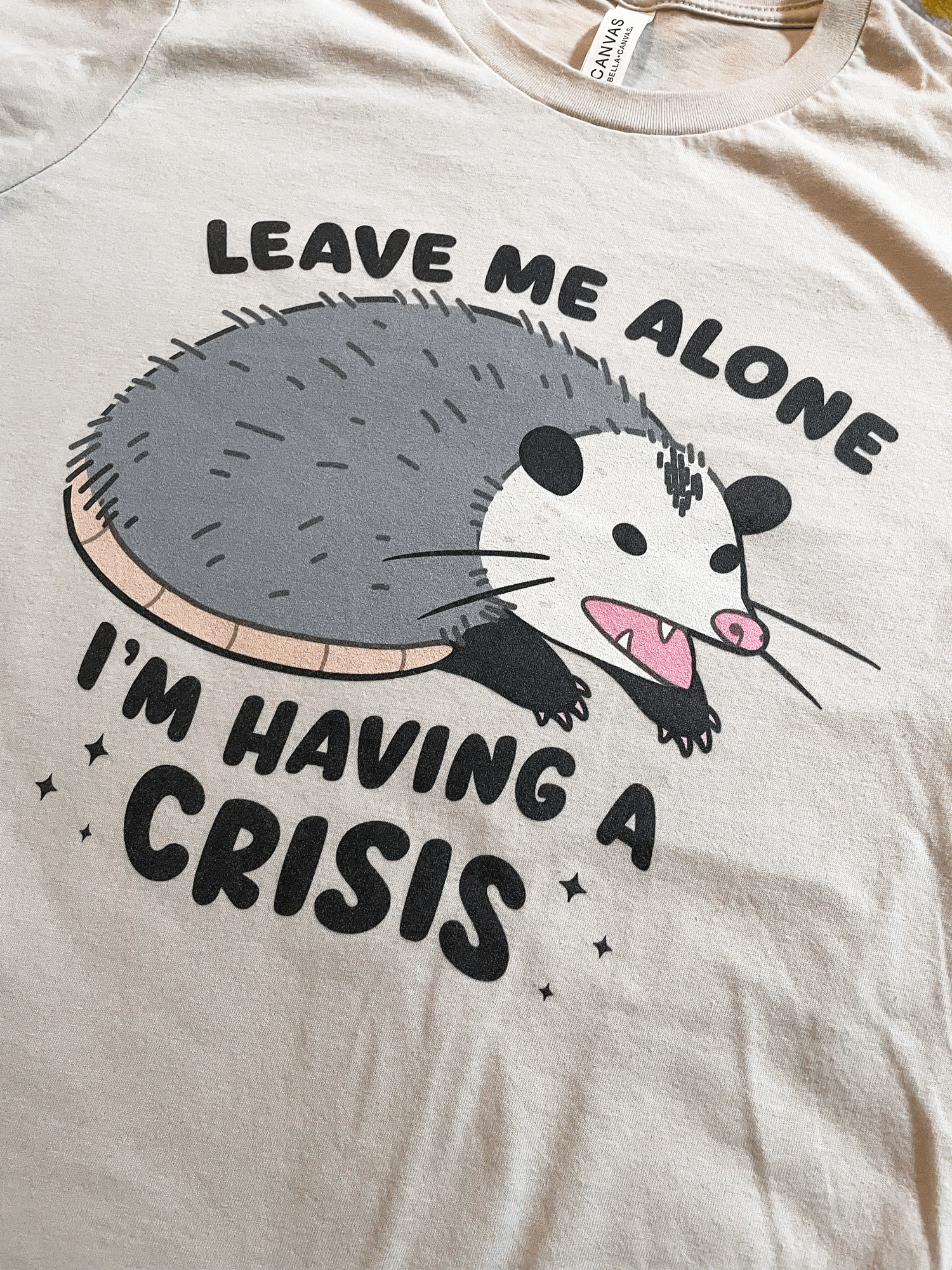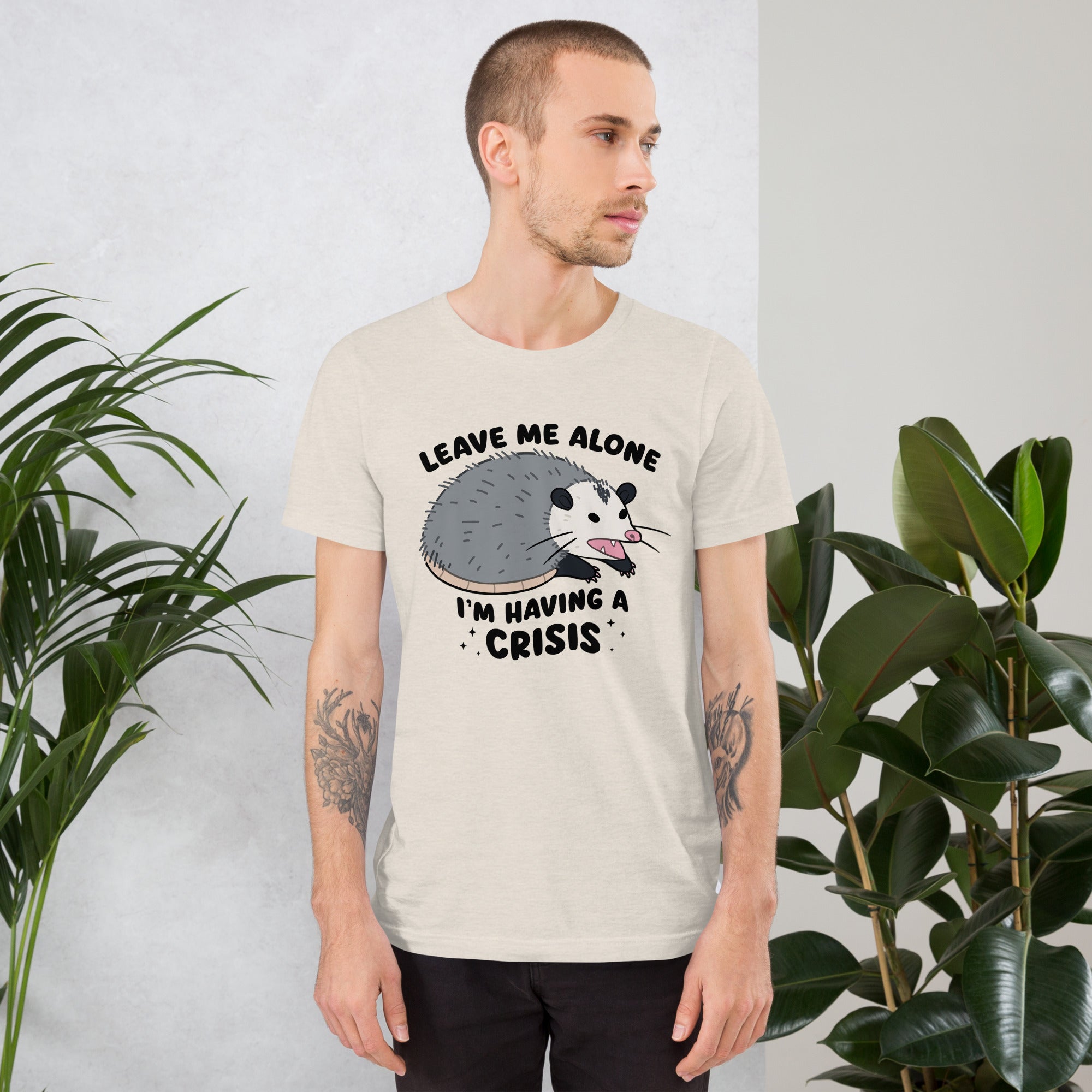 T-shirt with an opossum graphic and text 'Leave me alone I'm having a crisis' on a beige background.