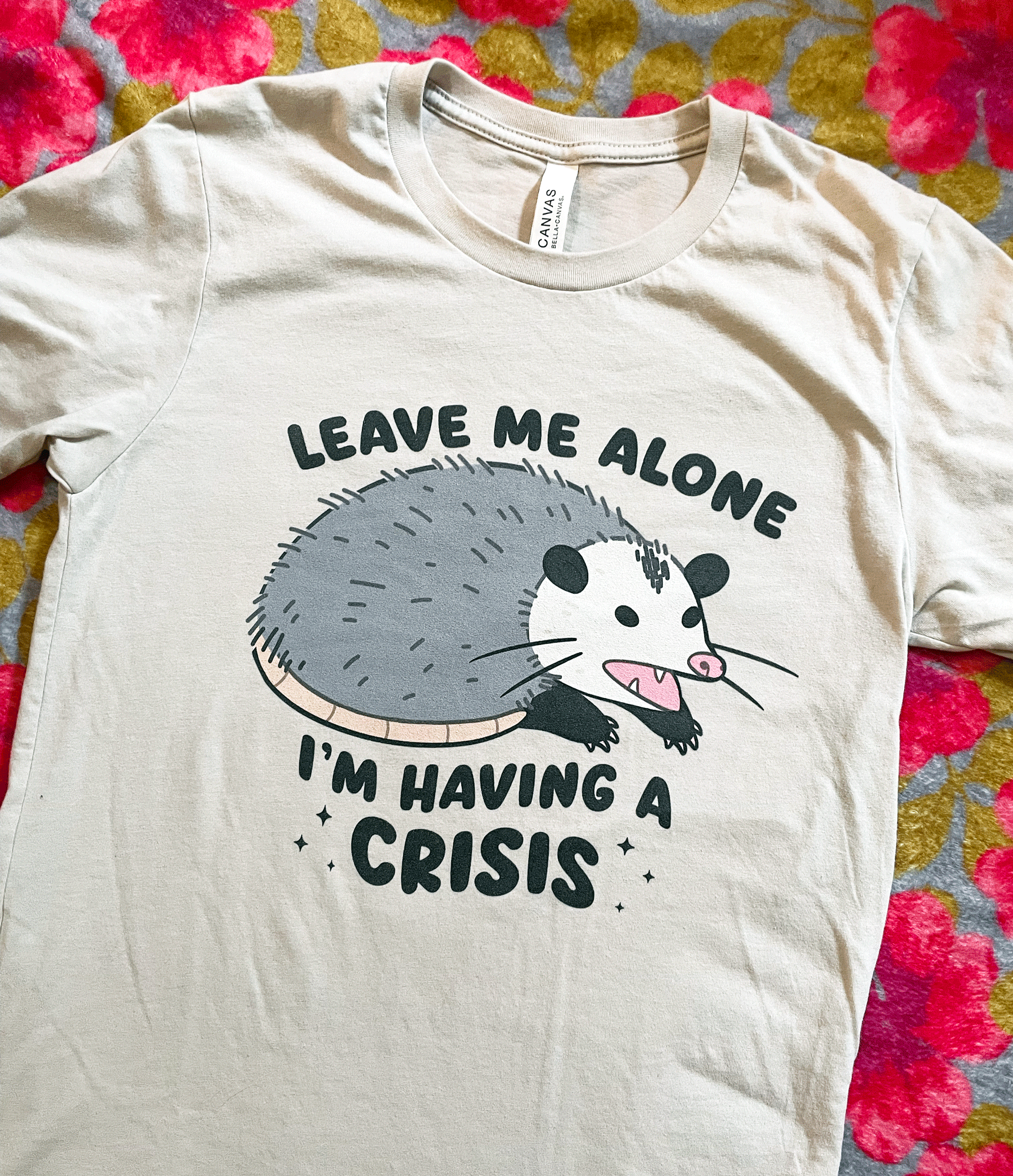 Beige t-shirt with an opossum graphic and text 'Leave me alone I'm having a crisis' on a floral background