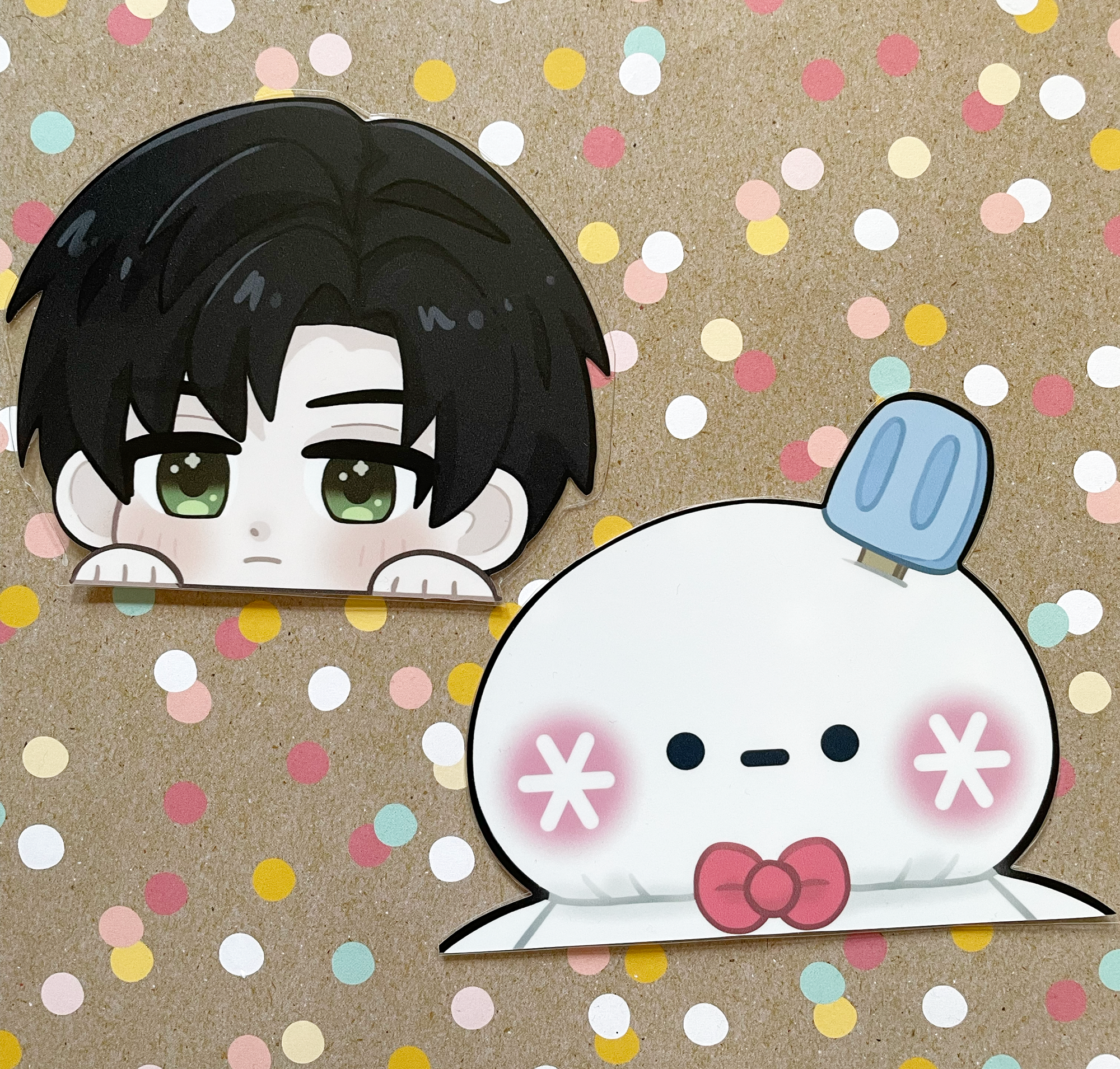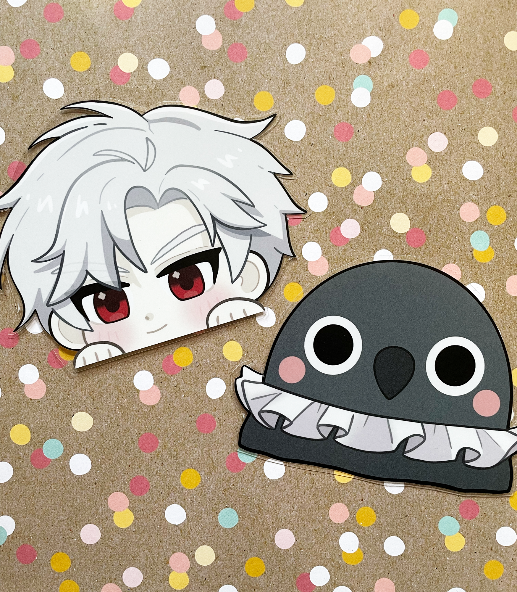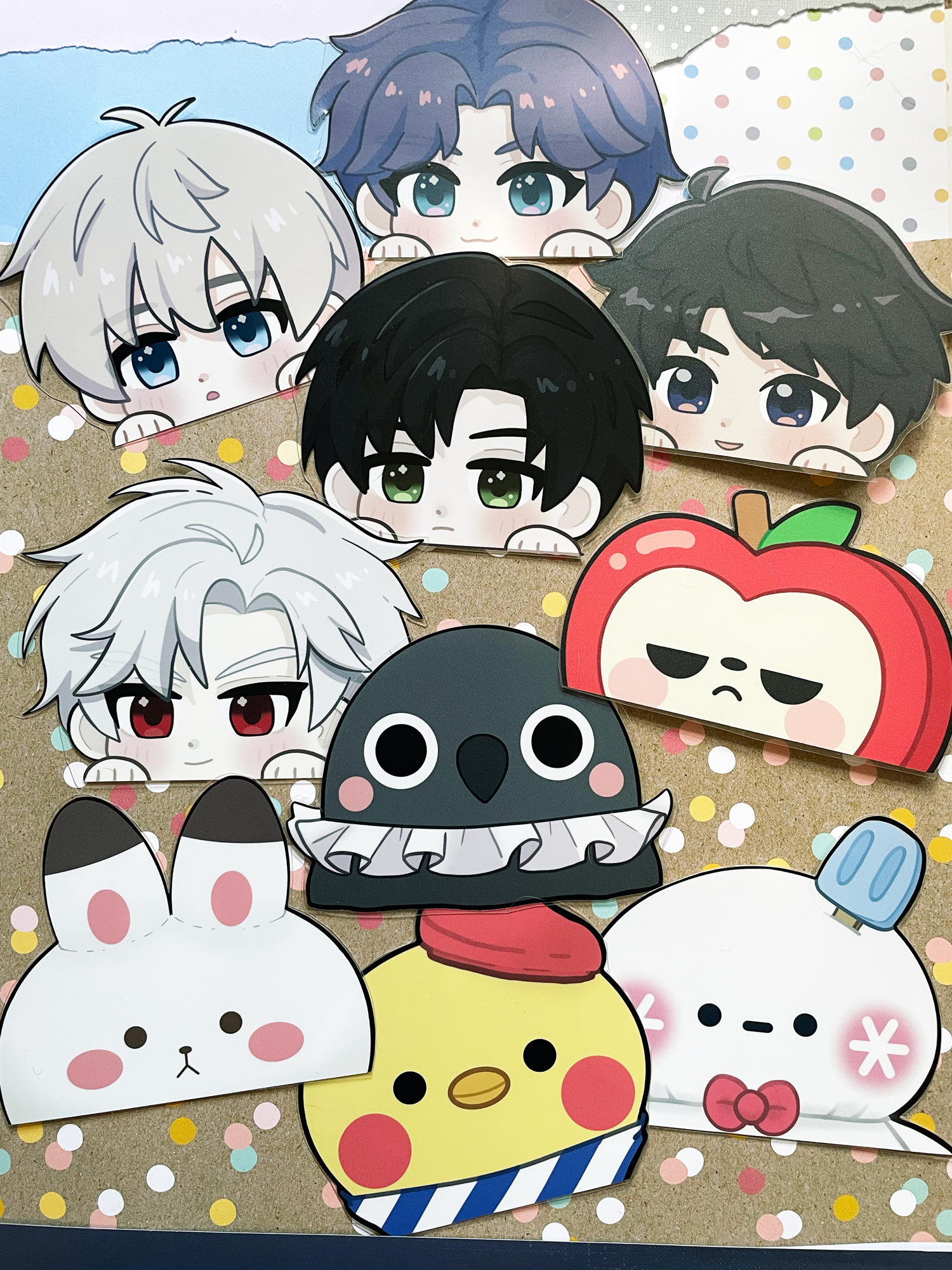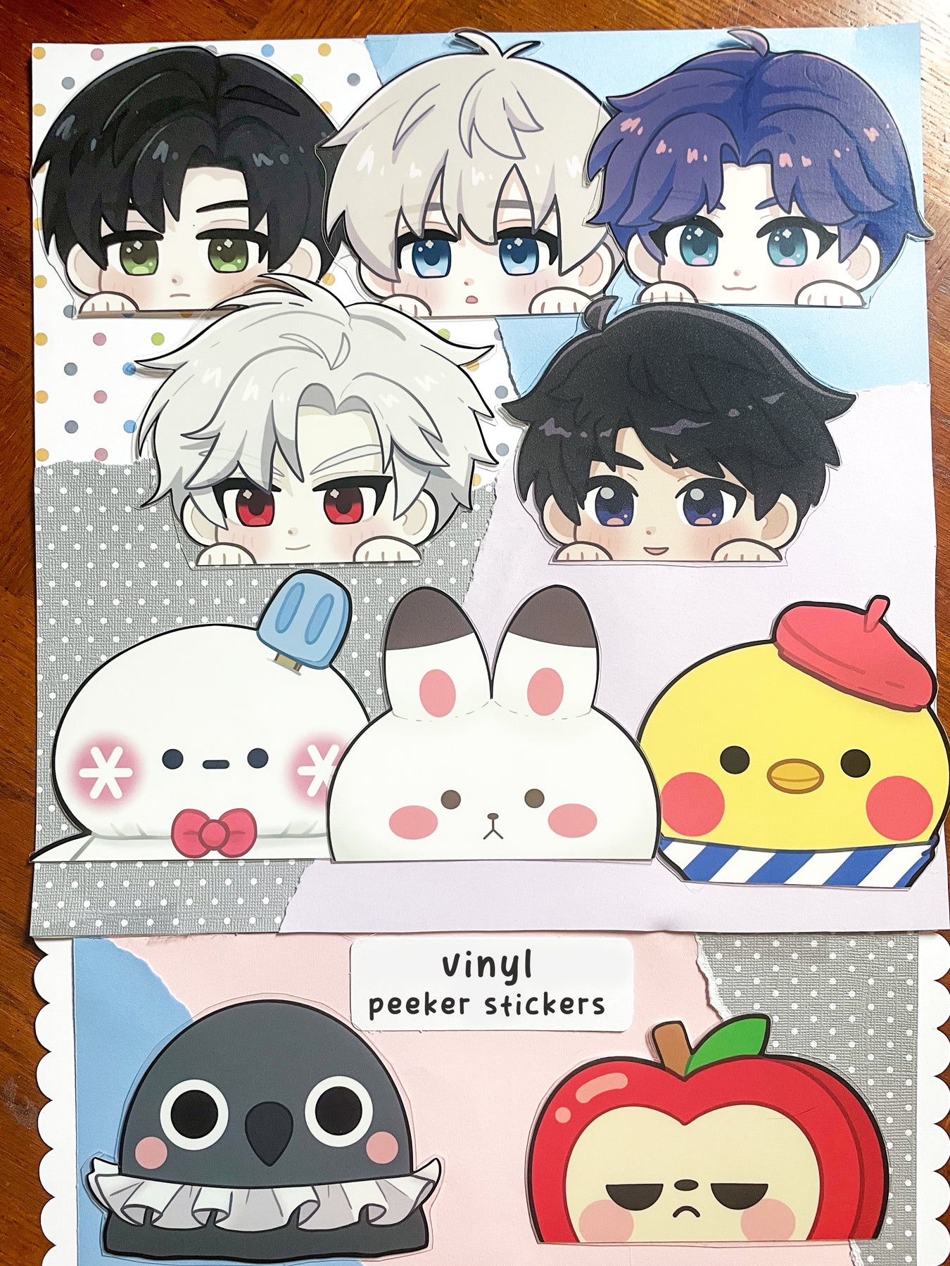 Waterproof, UV-resistant matte vinyl stickers featuring the love interests from Love and DeepSpace! Choose between Zayne, Xavier, Rafayel, Sylus and Caleb or their respective plushie mascots: Happy Snowman, Bunbun, Artsy Birb, Grumpy Crow, or Sunny Apple. These 'Peeker' style stickers lets these characters peek out of your windows, while standing up to the elements.