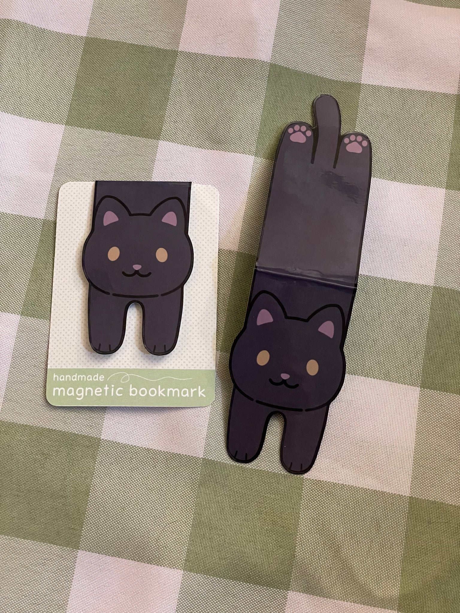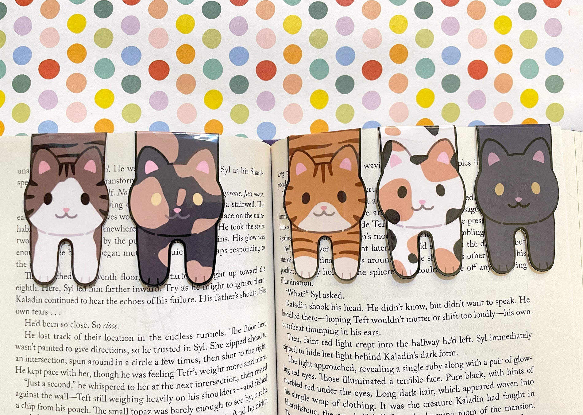 Laminated glossy cat bookmarks! Each bookmark has a set of magnets attached, so it hangs over the page of your book.